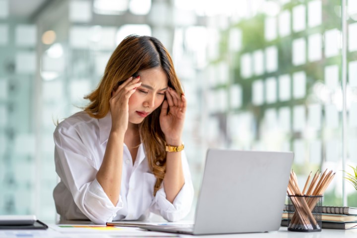 Stressed,Asian,Businesswoman,Having,Headache,At,Work,Concept,,Frustrated,Dizzy
